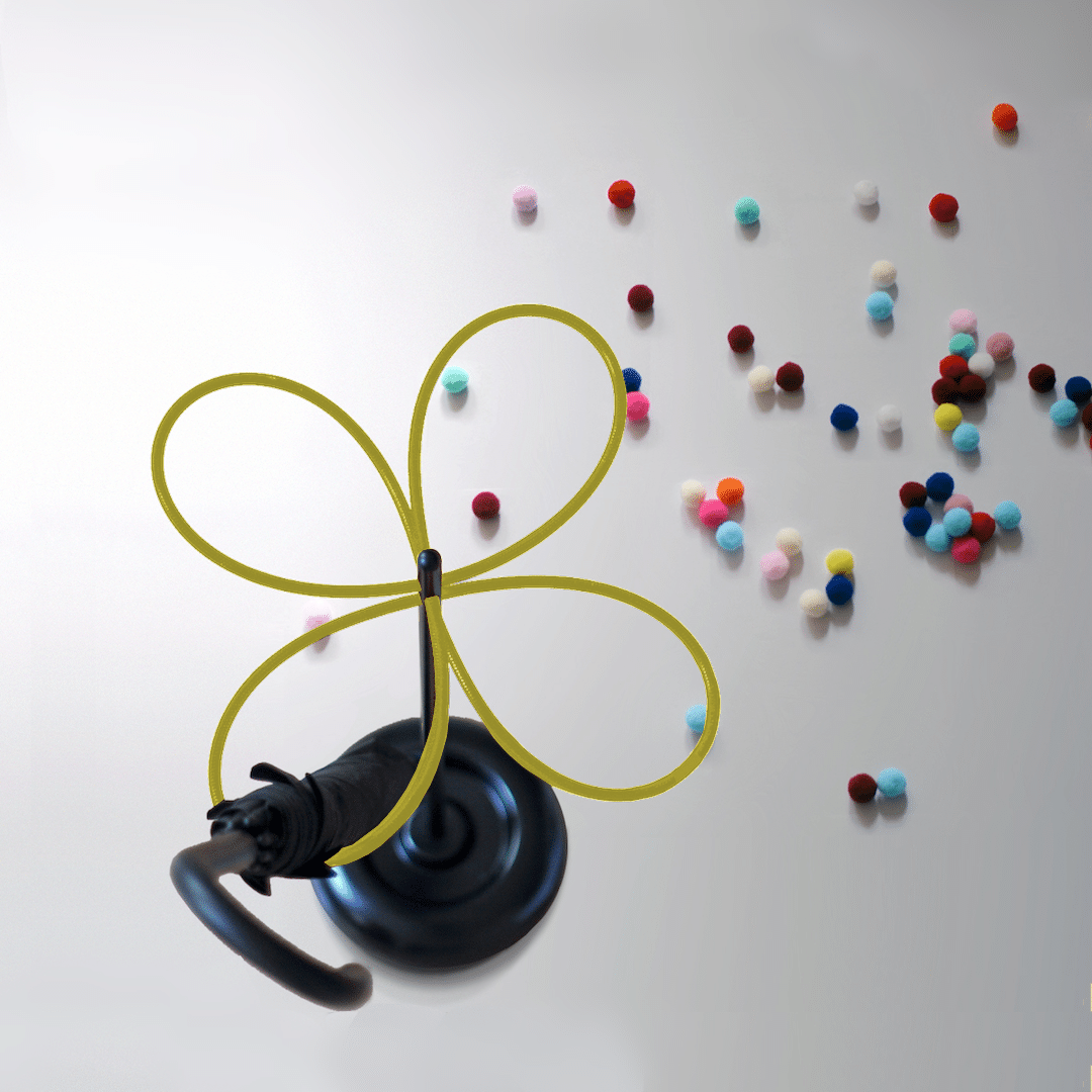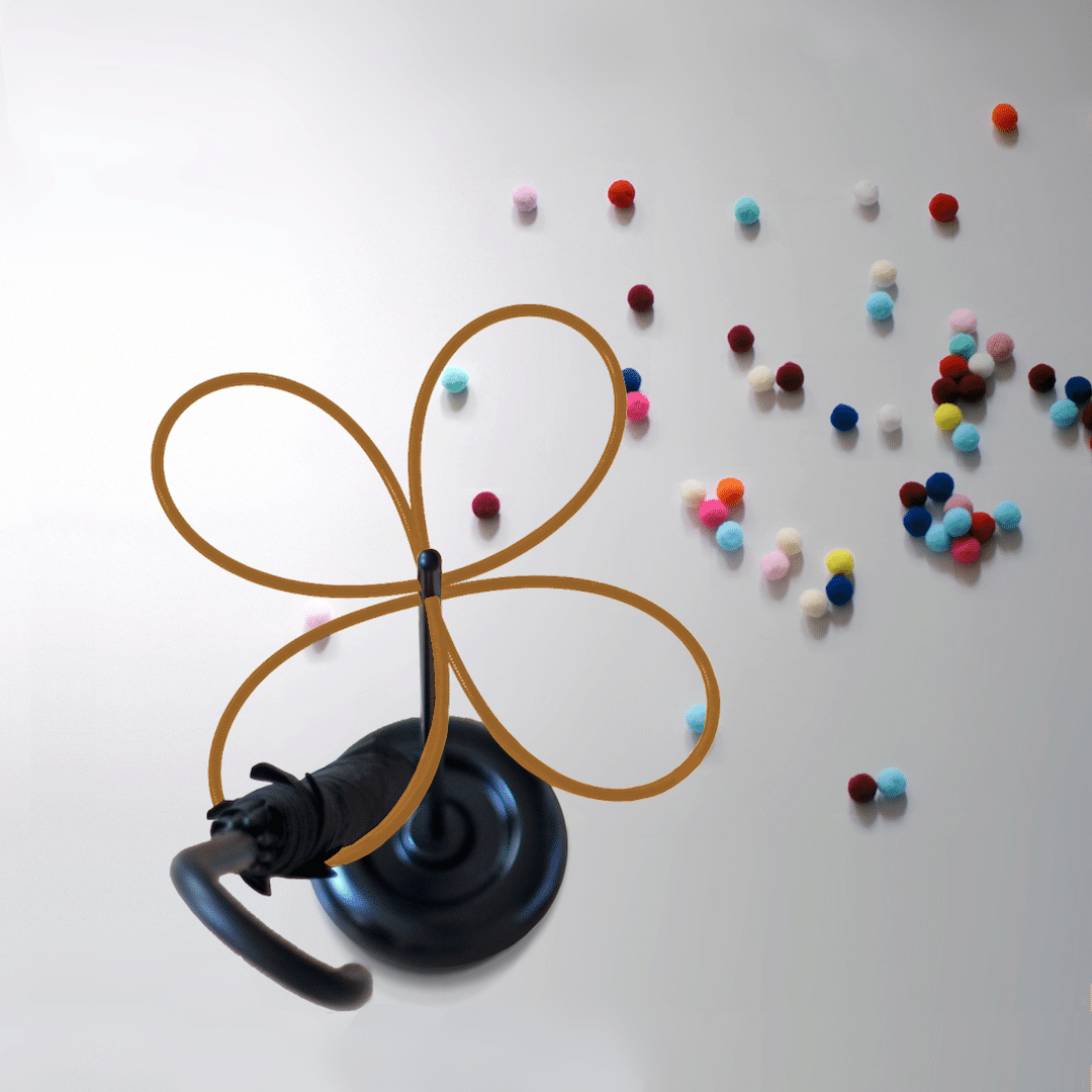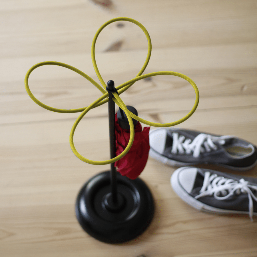 Der ‚Glücksklee‘ unter den Schirmständern. Oben bilden die bunten Schleifen vier kleeblättrig-blumige Fächer für lange Schirme. Aber auch Pocketschirme finden ihren Platz; sie werden einfach mit ihrer Schlaufe an der Spitze eingehängt. Der  Fuß ist robust mit einem standfesten Idealgewicht.