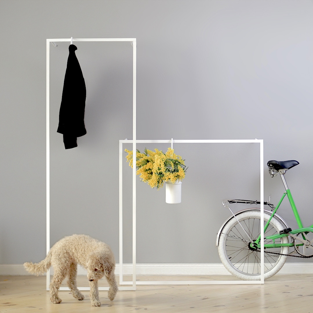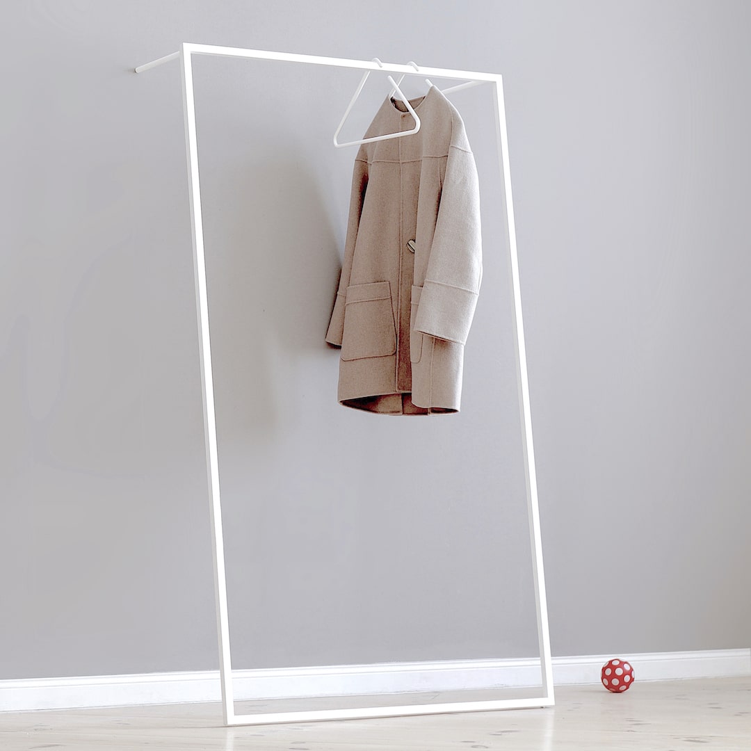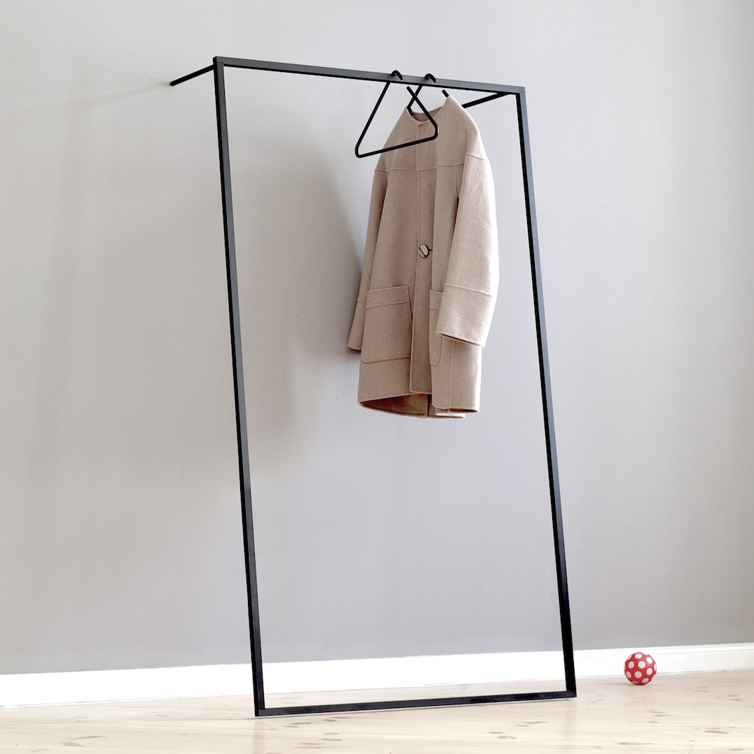 Die stabile Rahmenkonstruktion unterstützt den puristisch-skulpturalen Charakter. Ohne zusätzliche Befestigung, nur schräg an die Wand gelehnt rahmt das große Viereck wie ein Bilderrahmen alles ein, was dahinter steht oder reingehängt wird und setzt es so in Szene. Je mehr die Garderobe belastet wird, desto stabiler drückt sie sich an Wand und Boden fest.
